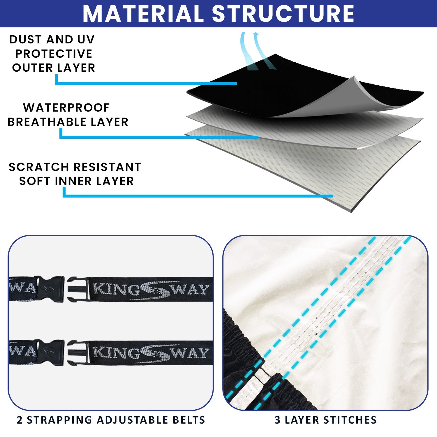 - 100% Waterproof Protection: Kingsway car body cover is designed to provide complete protection against rain, snow, and moisture. The innovative waterproof fabric ensures your vehicle remains dry and free from water damage, making it ideal for all weather conditions.