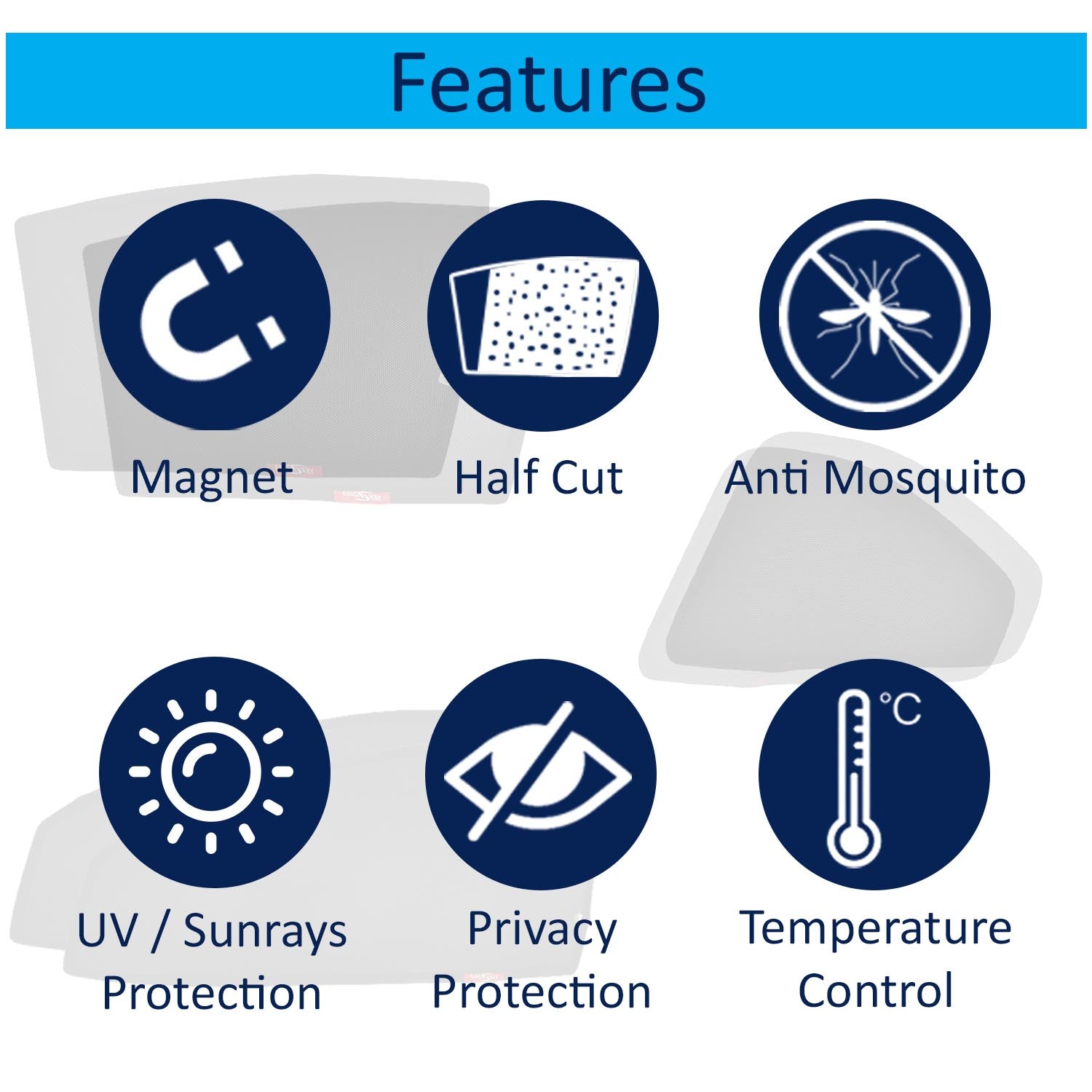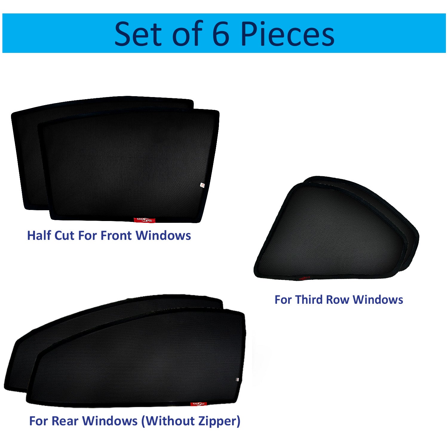 - In The Box: Kingsway Sunshade Pack Contains A Complete Set of 6 Pieces (Half Cut in Front Window) Magnetic Sunshades Customized to Perfectly Fit The Car. Install Them Easily to Each of The Windows of The Car to Enjoy A Cool and Comfortable Ride Throughout The Summer Days.