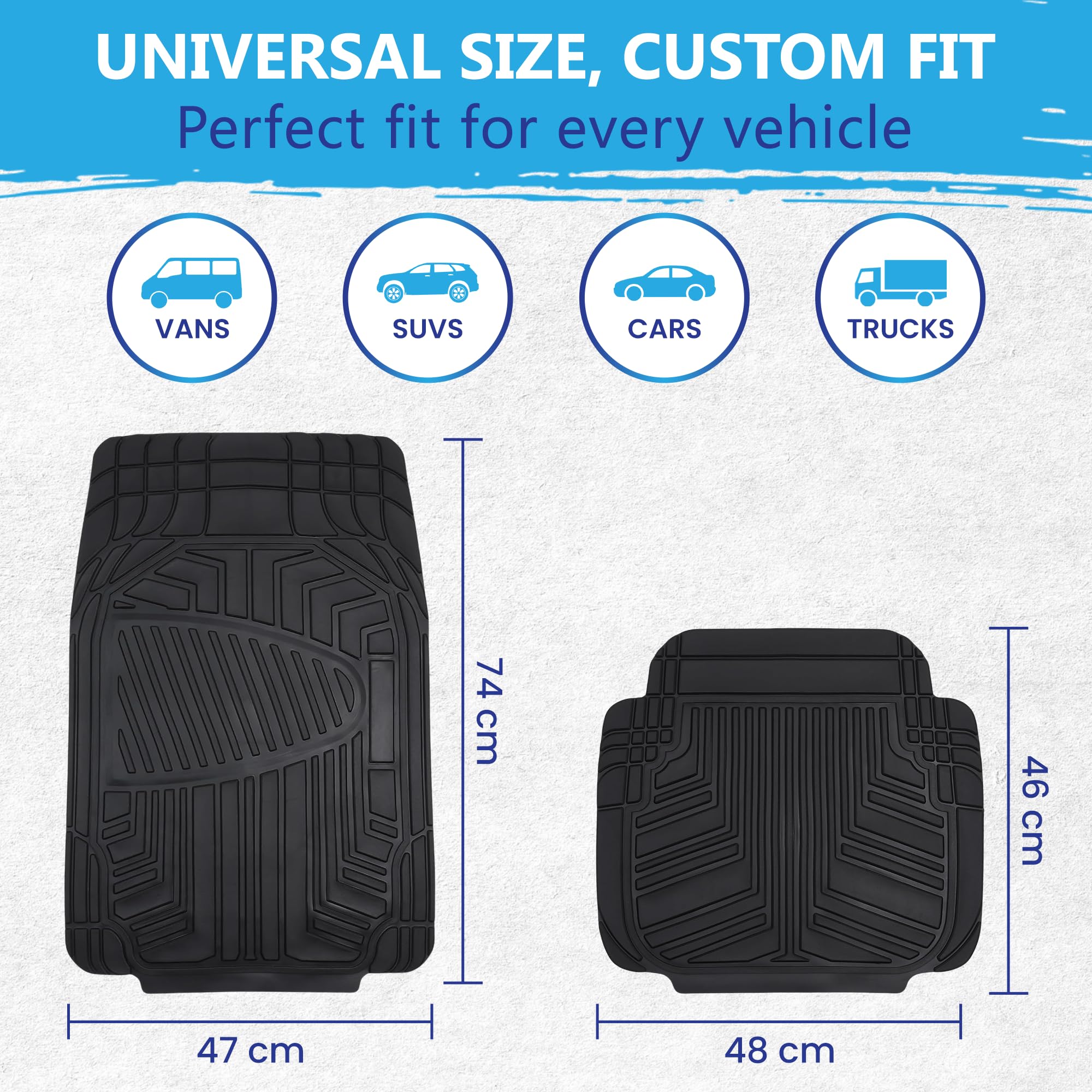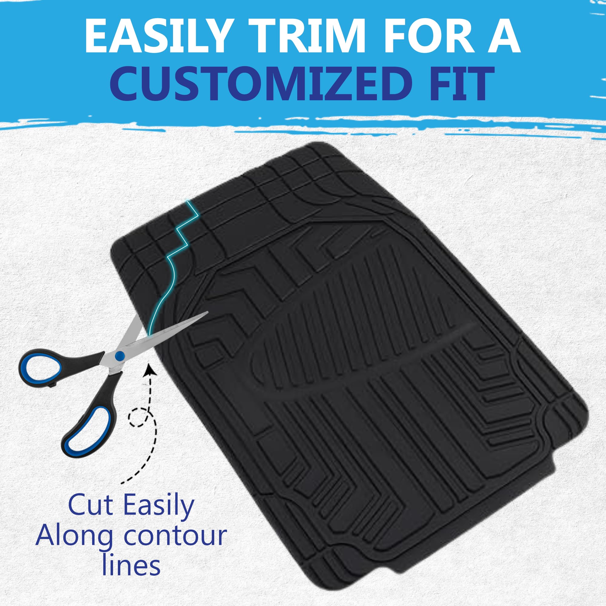 - Universal Fit: Compatible with most cars, trucks, SUVs, and vans for versatile use. Trimmable Edges: Easily trim the mats for a perfect, personalised fit to your vehicle’s floor shape.